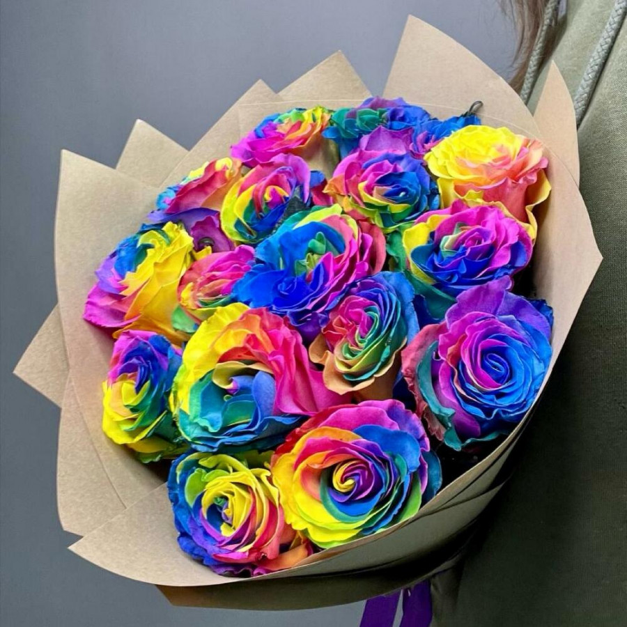 На фото букет из 17 радужных роз. В составе: роза 17 шт, крафт-бумага 2 шт, атласная лента 1 шт, . Все цветы свежие и ароматные, букет красиво оформлен и отлично подходит для подарка. Доступна доставка цветов или самовывоз.