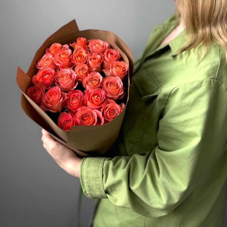 На фото букет из 21 оранжевой розы. В составе: роза 21 шт, крафт-бумага 2 шт, атласная лента 1 шт, . Все цветы свежие и ароматные, букет красиво оформлен и отлично подходит для подарка. Доступна доставка цветов или самовывоз.