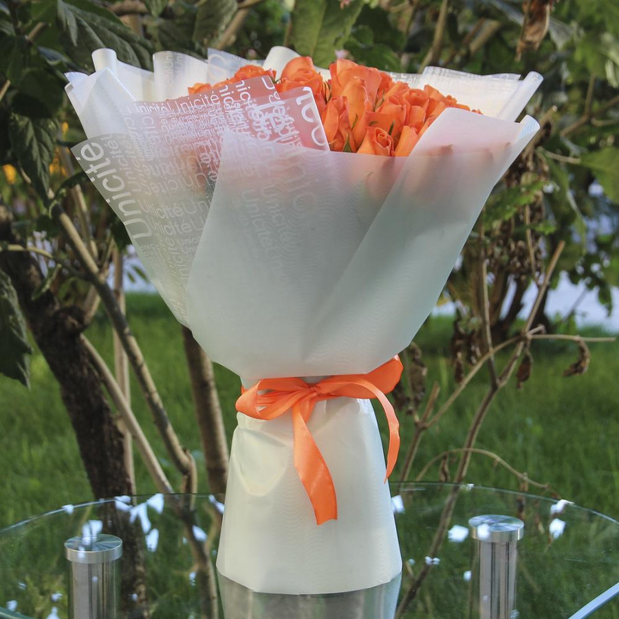На фото букет из 51 оранжевой розы. В составе: роза 51 шт, дизайнерская упаковка 2 шт, атласная лента 1 шт, . Все цветы свежие и ароматные, букет красиво оформлен и отлично подходит для подарка. Доступна доставка цветов или самовывоз.