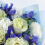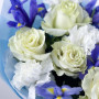 Букет из белых гвоздик, синих ирисов и белых роз в Ивантеевке